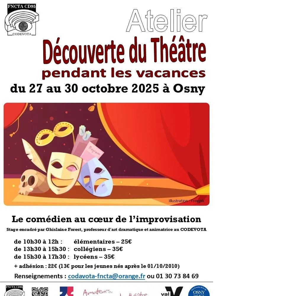 Le stage est encadré par Ghislaine Forest professeur d’art dramatique, et animatrice au CODEVOTA et se déroulera à Osny, la deuxième semaine des vacances scolaires de la Toussaint, du lundi 27 au jeudi 30 octobre