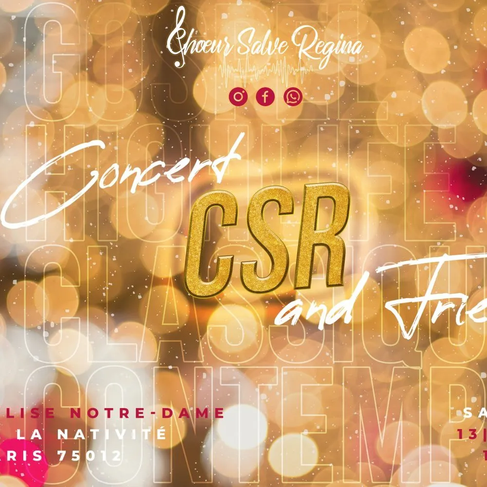 Deuxième édition CSR & Friends où plusieurs talents choristes et instrumentistes de la France, se joignent au chœur parisien Salve Regina pour former un ensemble vocal exclusif proposant une diversité de répertoire : gospel, classique, highlife, sacré d’église, traditionnel africain, musique moderne. 1h 30 de concert pour un presque tour du monde musical mais surtout pour chanter et partager la magie de Noël ensemble, en harmonie avec vous.