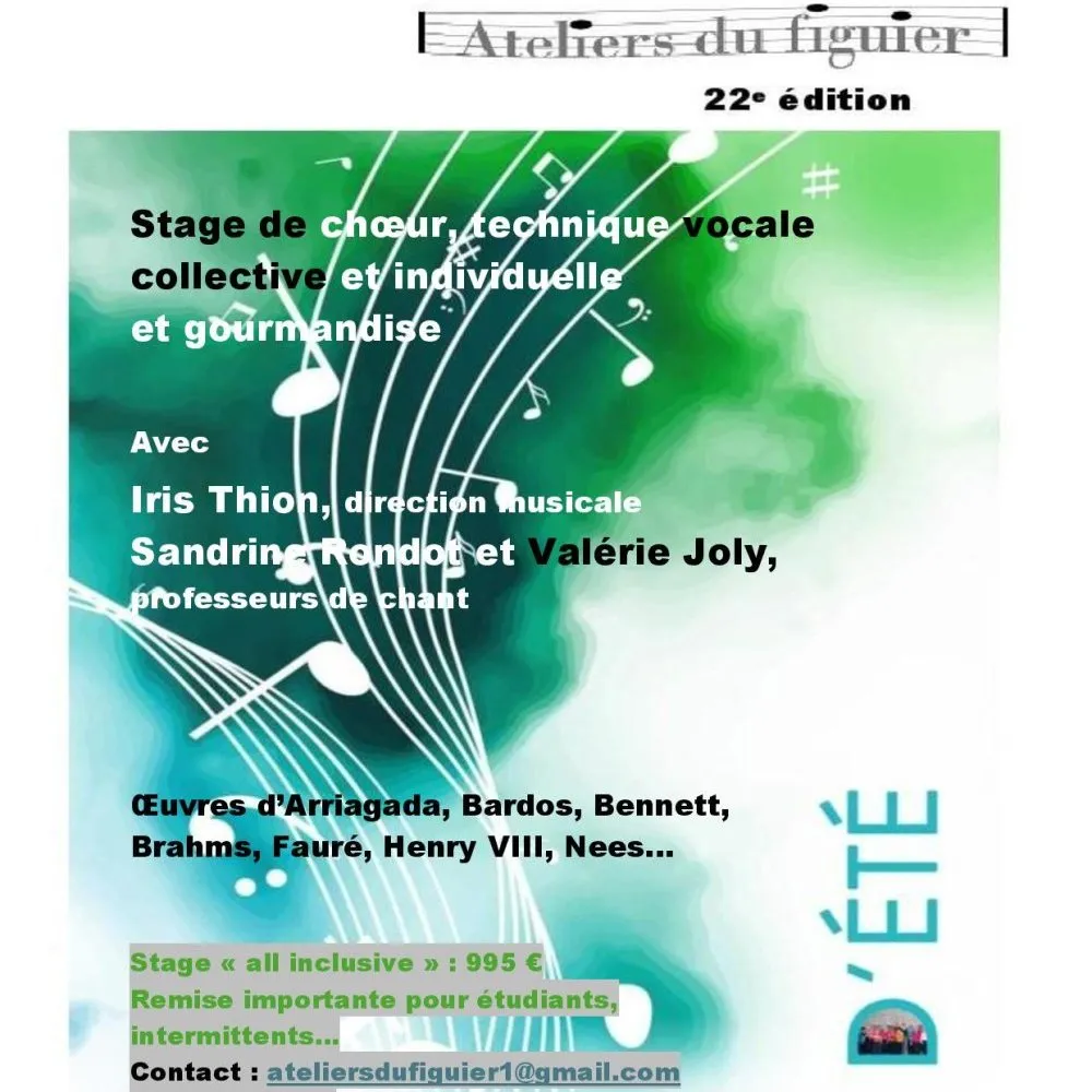 Du 18 au 25 août 2024, la 22e édition du stage estival des Ateliers du figuier sera dirigée par Iris Thion, avec la complicité de Sandrine Rondot et Valérie Joly, accueillie par Martine et Laurent Lutz dans le cadre magique du château de Mondésir.